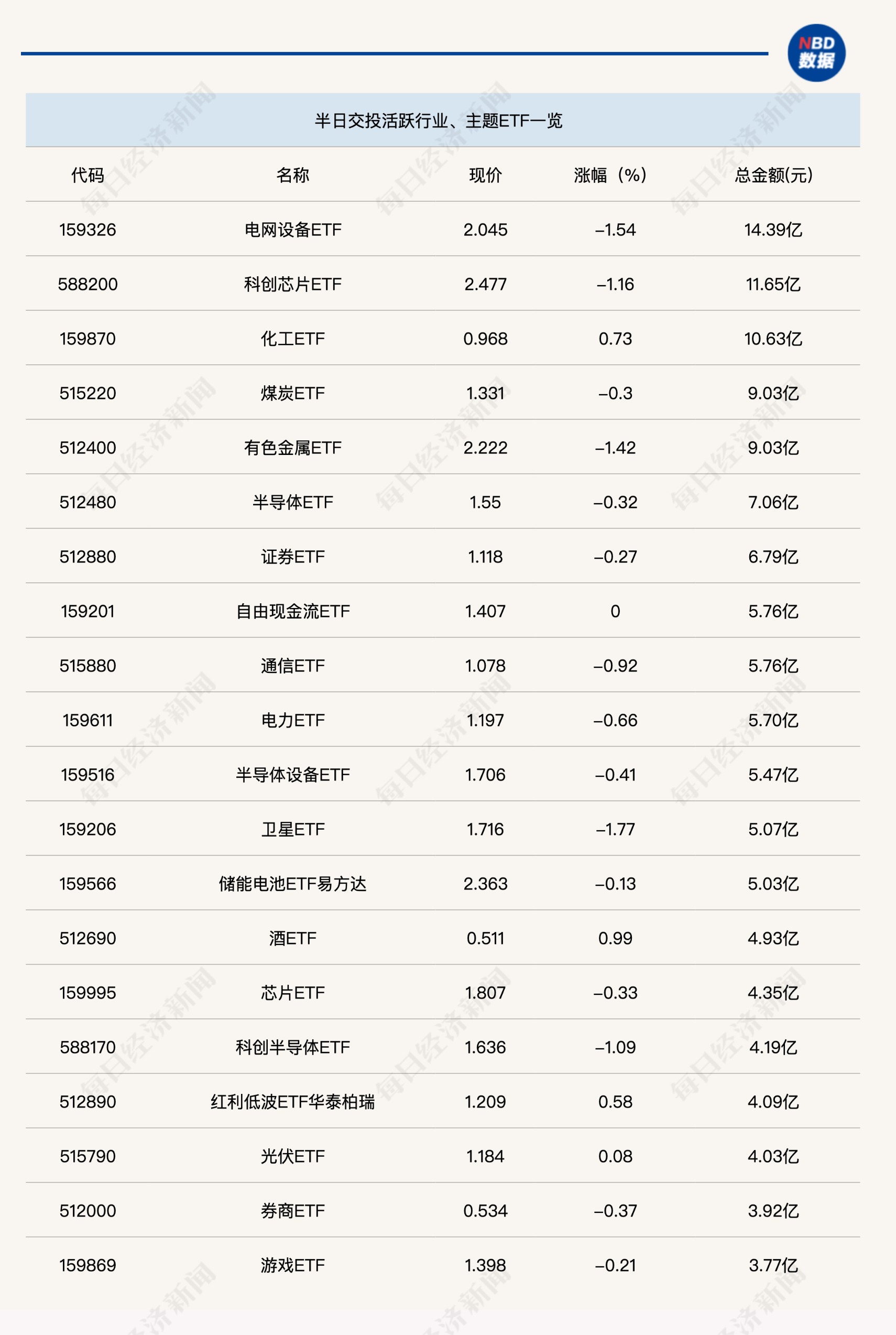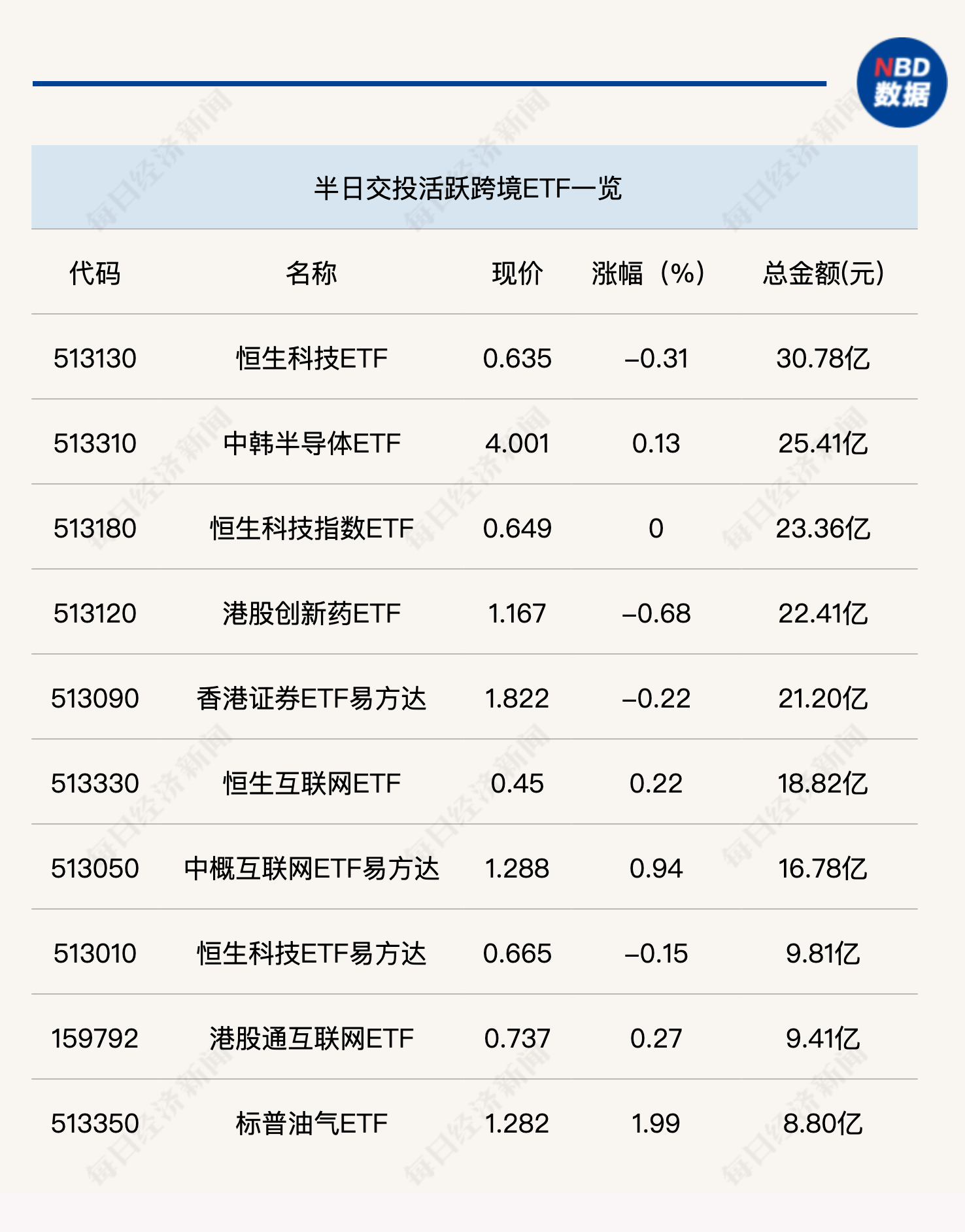今日上午,ETF交投整体继续缩量,化工ETF(159870)表现相对活跃,半日成交金额达到10.63亿元。跨境ETF方面,恒生科技ETF(513130)半日成交金额达到30.78亿元。